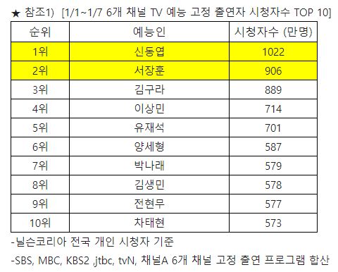 시청률조사회사 닐슨컴퍼니코리아(이하 닐슨코리아)에 따르면 1월 첫 주 본 방송 기준 KBS, MBC, SBS 지상파 3사 및 JTBC, tvN, 채널A 등 6개 채널 프로그램에 고정 출연한 예능인 시청자수를 조사한 결과, 전국 개인 시청자수 1000 만 이상을 확보한 예능인으로 신동엽이 1위에 올랐다.