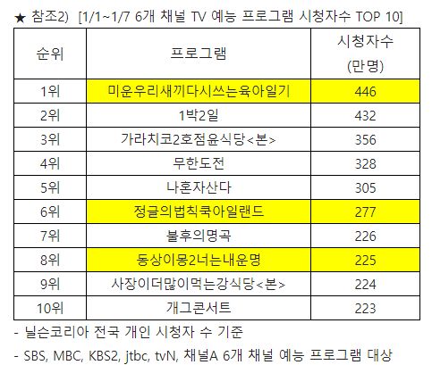 예능 프로그램의 순위로는 1위가 446만명의 ‘미우새’, 2위는 432만명의 ‘1박2일’, 3위는 356만명의 ‘윤식당’, 4위는 328만명의 ‘무한도전’, 5위는 305만명의 ‘나 혼자 산다’가 차지했다. SBS는 1위를 차지한 ‘미우새’ 외에 6위에 277만명의 ‘정글의 법칙’, 8위에 225만명의 ‘동상이몽2’로 TOP 10에 총 3개의 프로그램이 포함되었다.