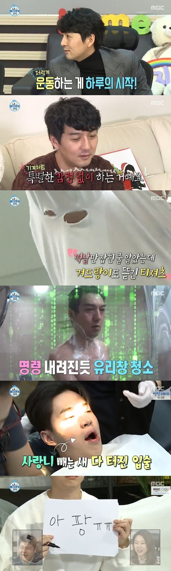 헬스장에서 구멍 뚫린 티셔츠를 입고 운동에 열중하는 그의 모습에 스튜디오는 초토화됐다. 이후 샤워를 하고 드라이기로 하체를 말리는 장면에서 박나래와 한혜진은 경악했다.