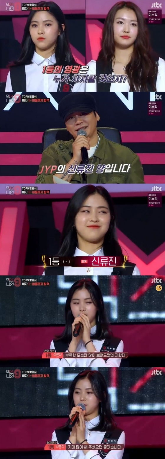 '믹스나인'에서 JYP 신류진이 1위를 차지했다.