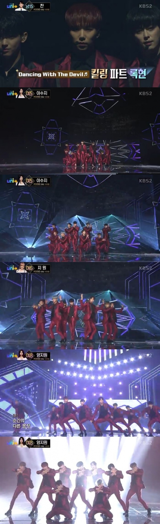 이날 방송에서는 록현, 준(유키스), 동현, 김티모테오, 세용, 지한솔, 한결, 제업, 수웅으로 이뤄진 'Dancing With The Devil(댄싱 위드 더 데빌)' 팀의 무대가 공개됐다.