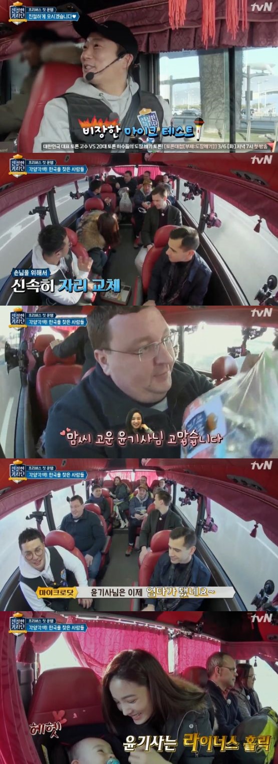 28일 오후 방송된 tvN 예능프로그램 '친절한 기사단'에서는 네 명의 MC가 스페셜 버스를 운영하며 스웨덴, 홍콩, 스위스 등 3개국에서 온 9명의 외국인 손님들의 일일기사로 변신했다.
