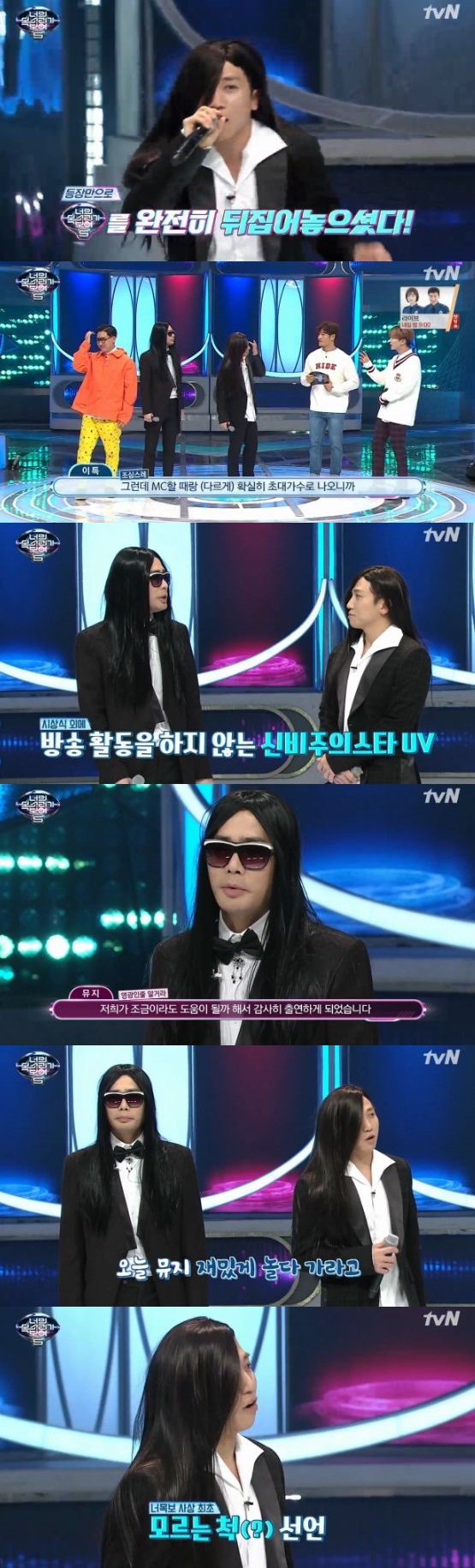 이날 '개가수의 끝판왕' UV는 무대 등장과 동시에 모두의 시선을 사로잡으며 격한 환영을 받았다. MC 이특은 유세윤을 보고 "MC 할 때랑 많이 다르다"고 말했고 이에 MC 김종국은 "많이 거들먹거린다"며 웃었다.