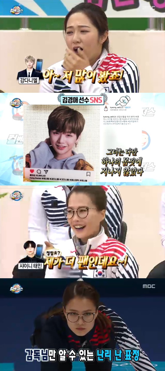 한편 '팀 킴' 선수들은 워너원 강다니엘, 샤이니 태민과의 전화 통화에 깜짝 놀라워하며 팬심을 드러냈다. 강다니엘은 "컬링 여자팀을 잘 안다. 김경애 선수도 물론 안다"고 말했고 김경애는 순간 어쩔 줄 몰라 하는 모습을 보이며 폭소를 자아냈다.