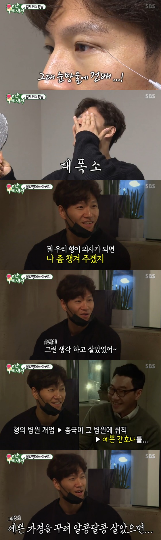 이날 방송에서는 김종국이 성형외과 의사로 일하고 있는 친형 김종명 씨와 만나는 모습이 담겨 눈길을 끌었다.