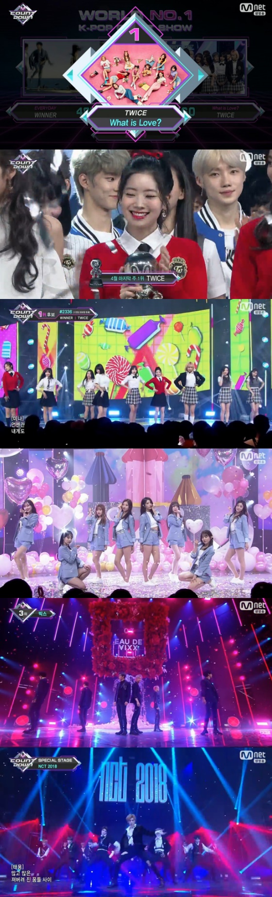 26일 방송된 Mnet 음악 프로그램 '엠 카운트 다운'에서는 4월 마지막 주 1위 후보로 위너의 'EVERYDAY(에브리데이)'와 트와이스의 'What is Love?(왓 이즈 러브)'가 1위 후보로 맞붙은 가운데, 트와이스가 위너를 제치고 1위를 차지했다.