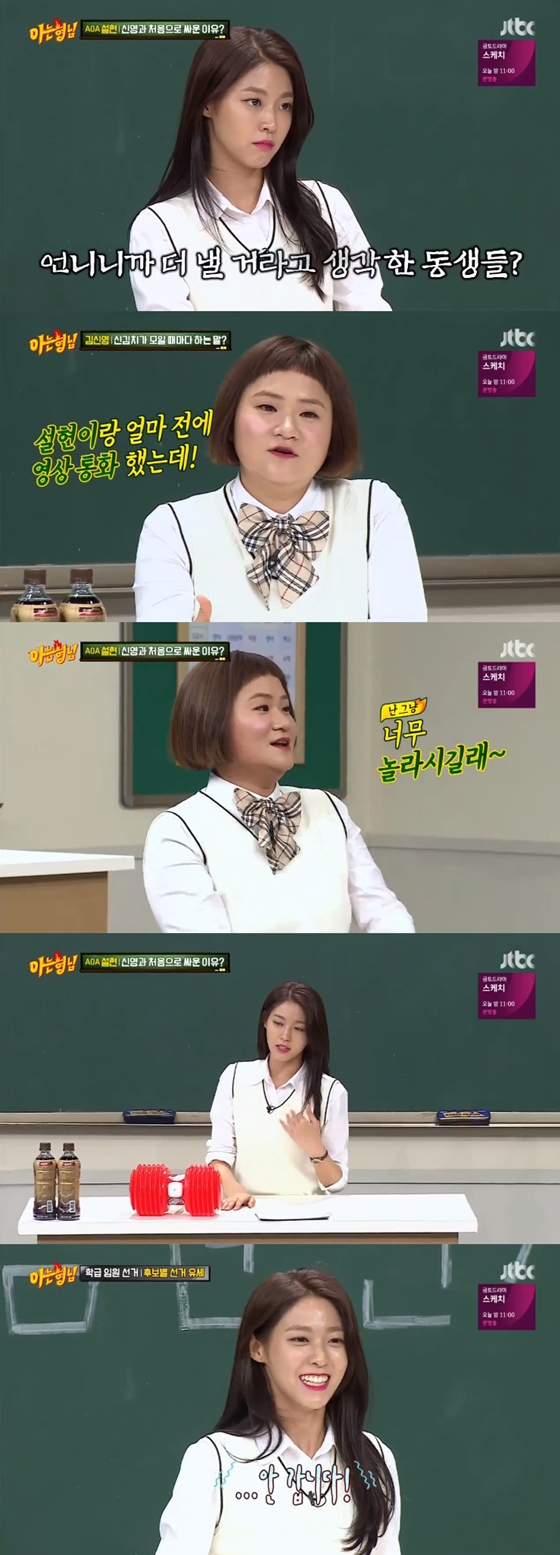 걸그룹 AOA 멤버 설현이 '아는 형님'에서 김신영과 함께 한 토크 호흡으로 웃음을 자아냈다.