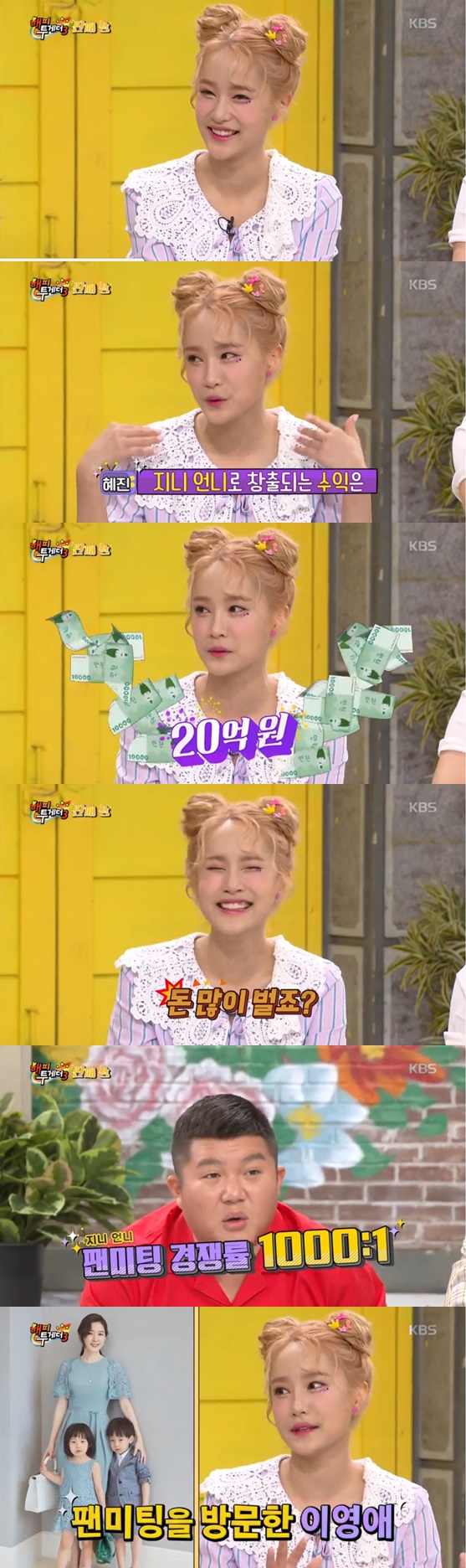 강혜진은 연수입을 묻는 질문에 "지니 언니로 얻는 수익은 1년에 20억 정도다"라며 "저도 회사 소속이라 월급을 받는다"라고 말했다.