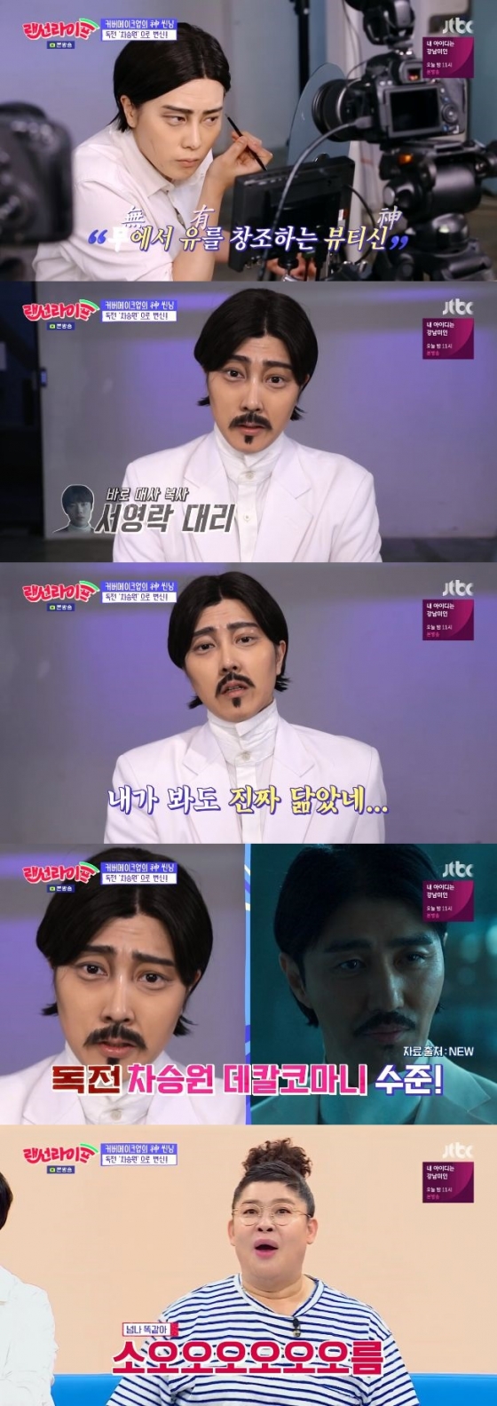 씬님은 콧구멍의 크기도 키우고 인중에 콧수염도 붙여 완전히 차승원이 됐다. MC 이영자는 "어머어머"하며 연신 놀란 듯한 표정을 지었다. 씬님은 "서영락 대리, 화가 많이 나죠?"라며 영화 속 대사를 성대모사 해 웃음을 자아냈다.