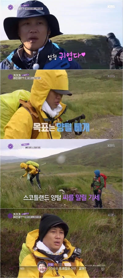 지난 10일 방송된 KBS 2TV 탐험중계방송 '거기가 어딘데??'회에서는 탐험대 지진희, 차태현, 조세호, 배정남이 스코틀랜드 스카이섬 2일차에 폭풍우의 습격을 받아 탐험 일정 최대 위기의 겪는 모습이 그려졌다.