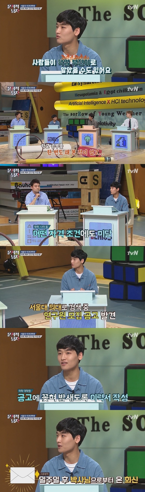 그는 "사실 학력이나 자격 조건 미달이다. 평소에 의학 분야에 관심이 있다 보니 서울대 의대로 검색하던 중 연구원 모집 공고를 발견했다. 밤을 새서 이력서를 작성해 보냈는데 면접을 보러 오라는 회신을 받았다"고 설명했다. 이어 "면접을 보러 가서 부학장님이 좋게 보신 것 같다. 그래서 합격했다"고 덧붙였다.