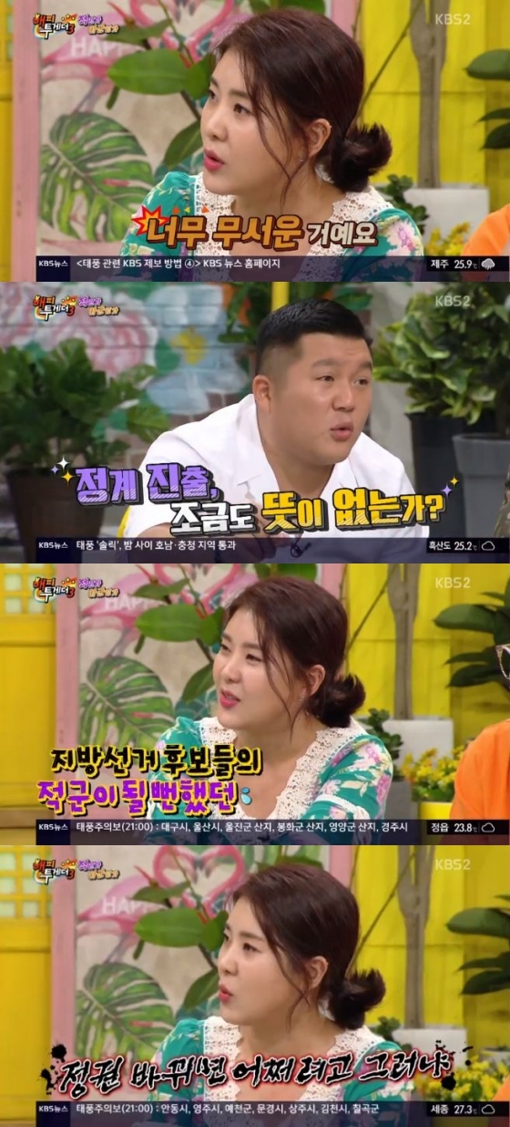 '해피투게더3'에서 강유미가 정계 진출에 관심이 없다고 밝혔다.