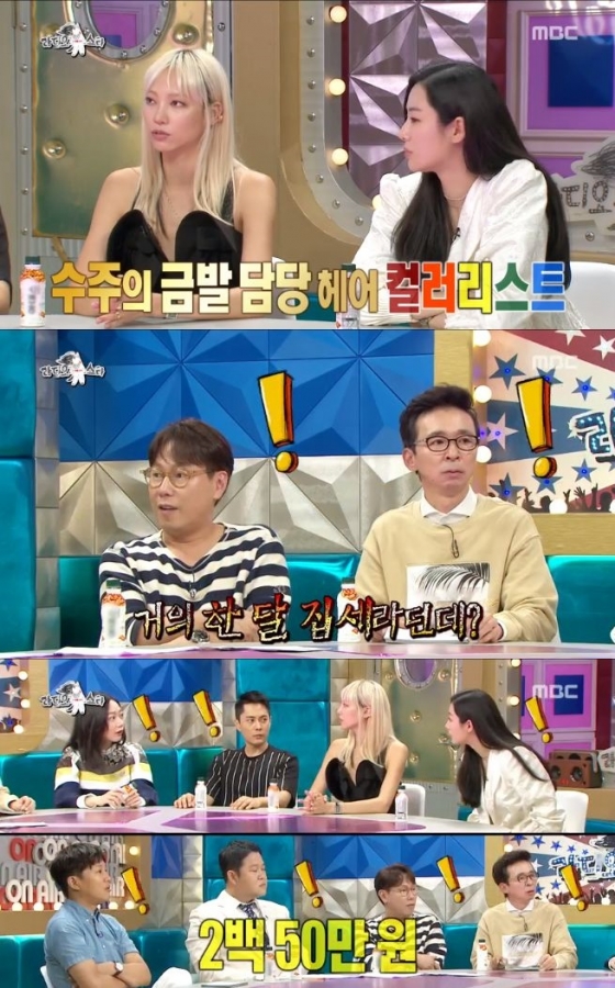 '라디오스타'에서 모델 박수주가 매달 250만원을 내고 탈색을 한다고 말했다.