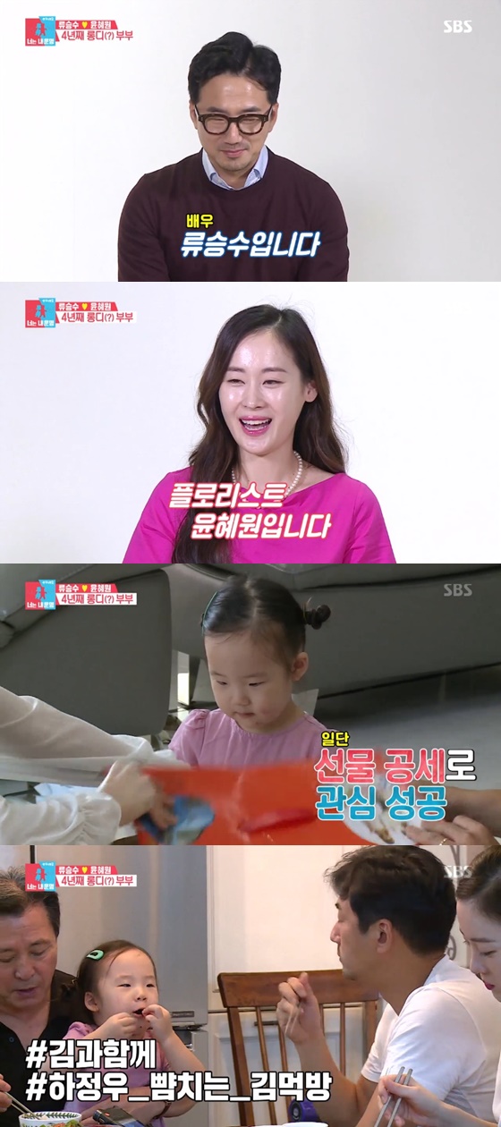앞서 새로 합류한 류승수♥윤혜원 부부의 일상이 공개됐다. 두 사람은 4년 째 서울과 대구를 오가는 롱디 부부라는 것. 류승수는 "4년차 주말부부 선두주자 배우 류승수입니다", 아내 윤혜원은 "저는 류승수의 아내, 플로리스트 윤혜원입니다"라고 자신을 소개했다.