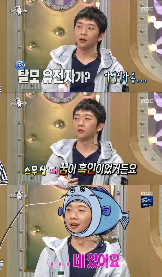 그는 이날 탈모를 깜짝 고백하기도 했다. 트레이드 마크인 '비니'를 쓰지 않고 등장한 그는 "(비니를 쓴 뒤) 점점 이마가 넓어지는 것 같다"며 "M자가 시작되고 있다"고 털어놨다. 이어 "스무 살 때 꿈이 흑인이었다. 흑인 머리를 한다고 머리를 누르고 면도칼로 라인도 따고, 그러다가 (이마가) 넓어졌는데, 거기다 비니를 쓰니까 (M자) 속도가 엄청 빨라지더라"고 토로했다.