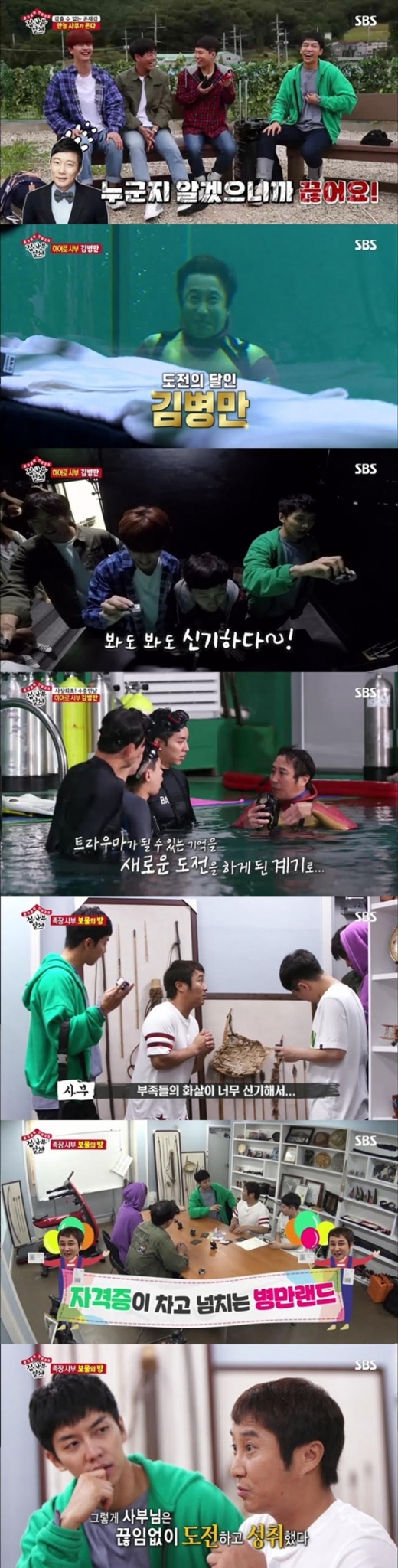 사부 김병만은 자신이 물 속에 자주 있는 이유에 대해 말해줬다. '정글의 법칙' 초창기 스태프 배가 뒤집혔고, 그는 스태프를 구하러 가다가 물에 대한 트라우마가 생겼던 것. 김병만은 "그 때 이후로 물과 친해지기 위해 시간 날 때마다 여기에 온다"고 말했다. 멤버들은 7M 바닥에서 워터 도넛 만들기에 나서며 사부의 도전정신을 서서히 배워나갔다.