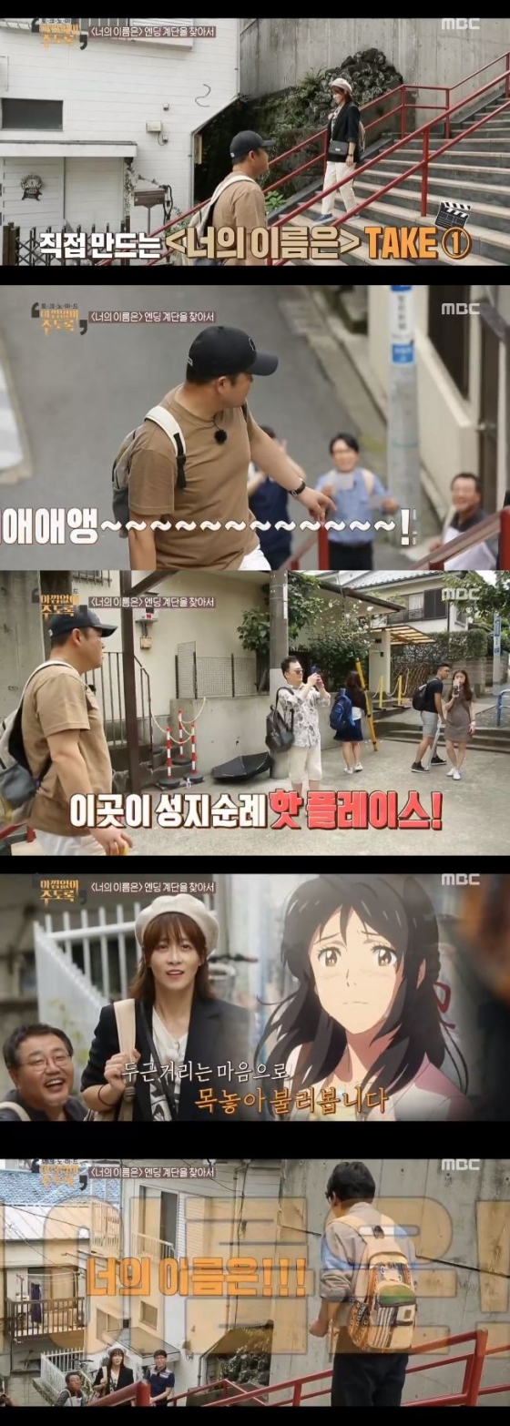 이날 방송에서 남창희는 영화 '너의 이름은'의 배경이 된 계단으로 안내했다. 이곳에서 류현경과 김구라는 즉석으로 극 중 주인공을 연기했다. 류현경은 "너의 이름은"이라며 아련하게 김구라를 바라봤고, 김구라는 단호히 이를 무시했다.