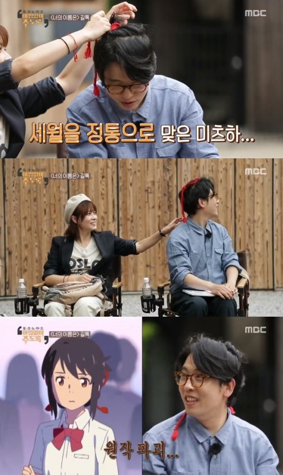 그러면서 류현경은 출연진들에게 영화에서 나온 것과 같은 붉은 끈을 건넸다. 출연진들은 팔에 붉은 끈으로 매듭을 지었다. 류현경은 직접 남창희의 머리에 붉은 끈으로 머리를 묶어 줬다. 그러자 남창희는 "타키군"이라고 새침하게 말하며 '너의 이름은' 속 여자 주인공인 미츠하로 변신했다.