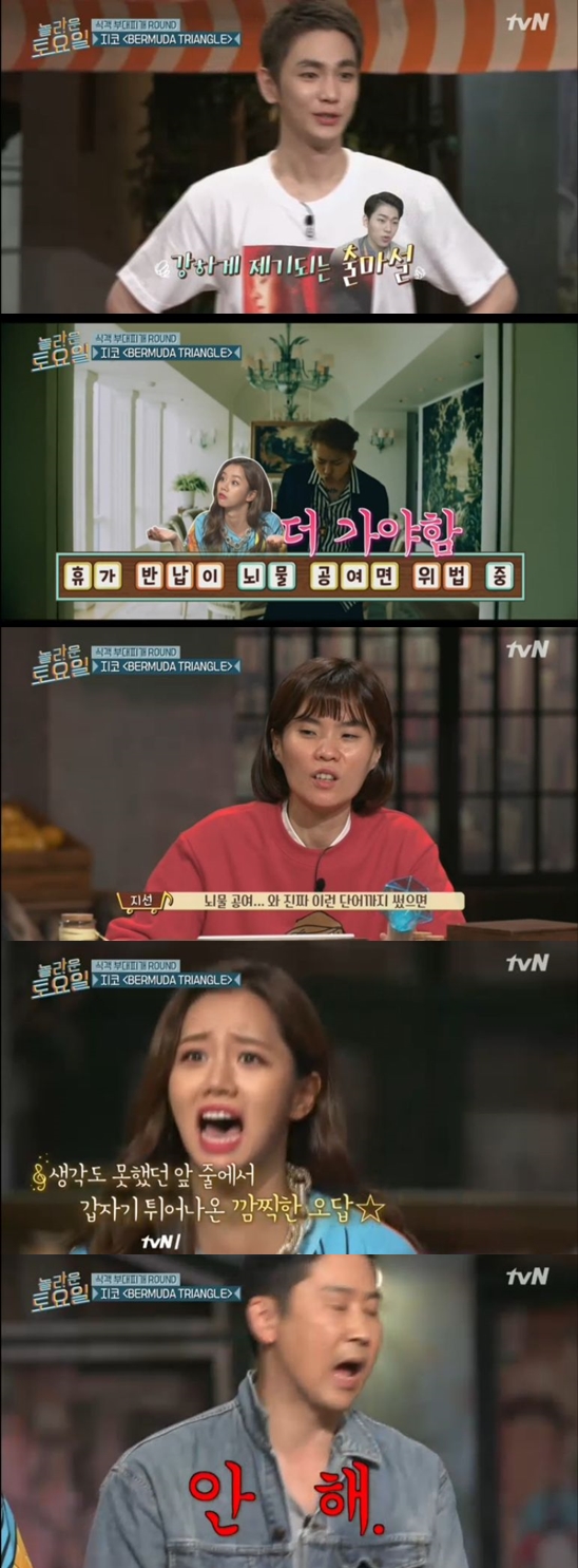 '놀라운 토요일' 멤버들은 지코의 'BERMUDA TRIANGLE' 노래 가사를 맞추기 위해 고군분투 했다. 멤버들은 '과로가 체질 안 해 링거투혼 휴가반납이 뇌물공여면 위법중'이라는 가사에서 '뇌물 공여'를 맞추지 못해 헤맸다.