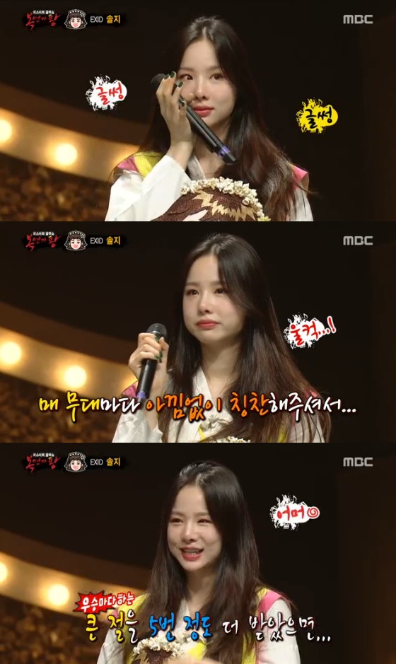 걸그룹 EXID 멤버 솔지가 아쉽게 '복면가왕' 6연승 도전에 실패했다. 솔지는 '복면가왕'을 통해 많은 사랑을 받은 것에 대해 감사함을 전하고 눈물을 흘렸다.