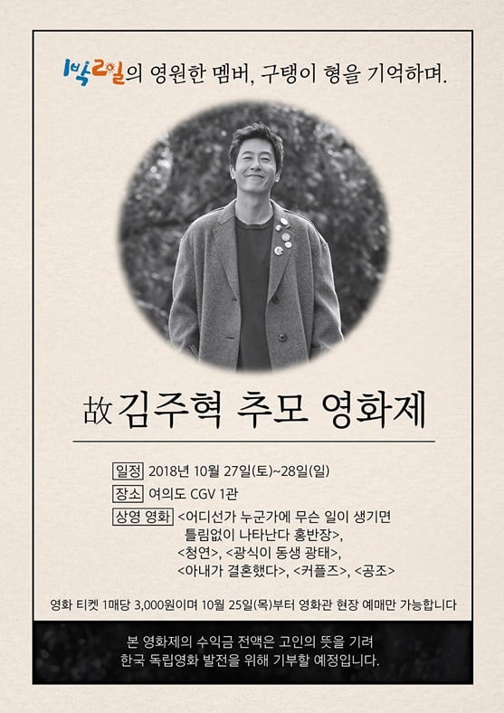 영화는 25일부터 현장 예매만 가능하며, 티켓 1매당 3000원이다. 영화제의 수익금 전액은 고 김주혁의 뜻을 기려 한국 독립영화 발전을 위해 기부할 예정이다.