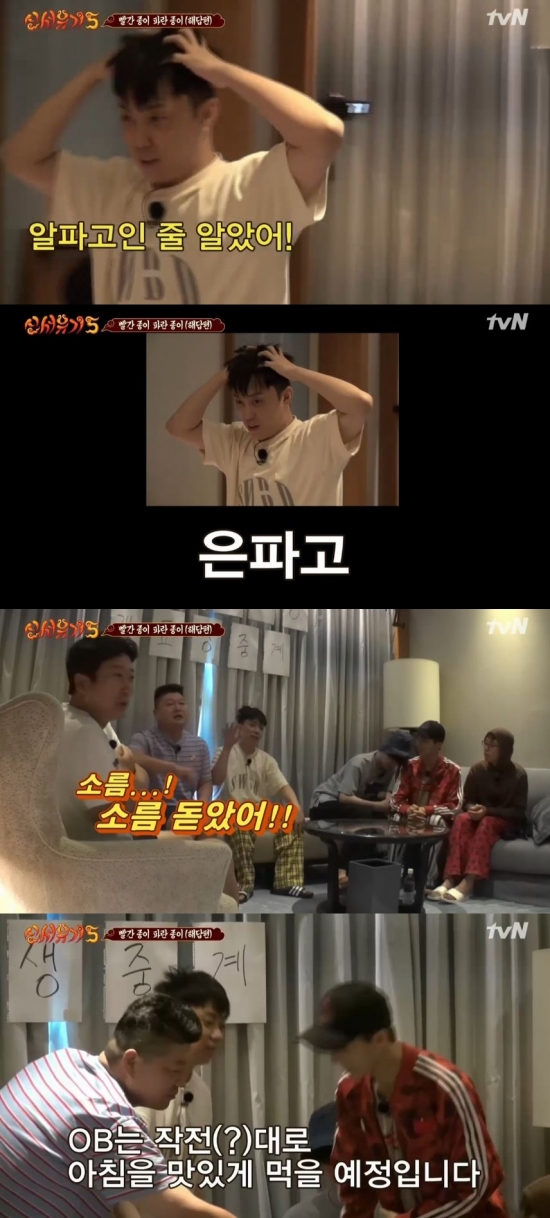 안재현, 피오, 송민호의 YB 팀, 강호동, 이수근, 은지원의 OB 팀으로 나눠 기상 미션을 진행하게 됐다. 기상 미션 전날 이들은 모든 카드를 모아 바닥에 깔고 가위바위보해서 이긴 사람이 종이를 랜덤으로 가져가기로 했다. 그 결과 송민호는 5장의 카드를 가지게 됐다. 피오는 2장, 이수근은 3장, 은지원과 강호동은 각각 1장씩 가져갔다. OB 팀과 YB 팀의 두뇌 싸움이 시작됐다.