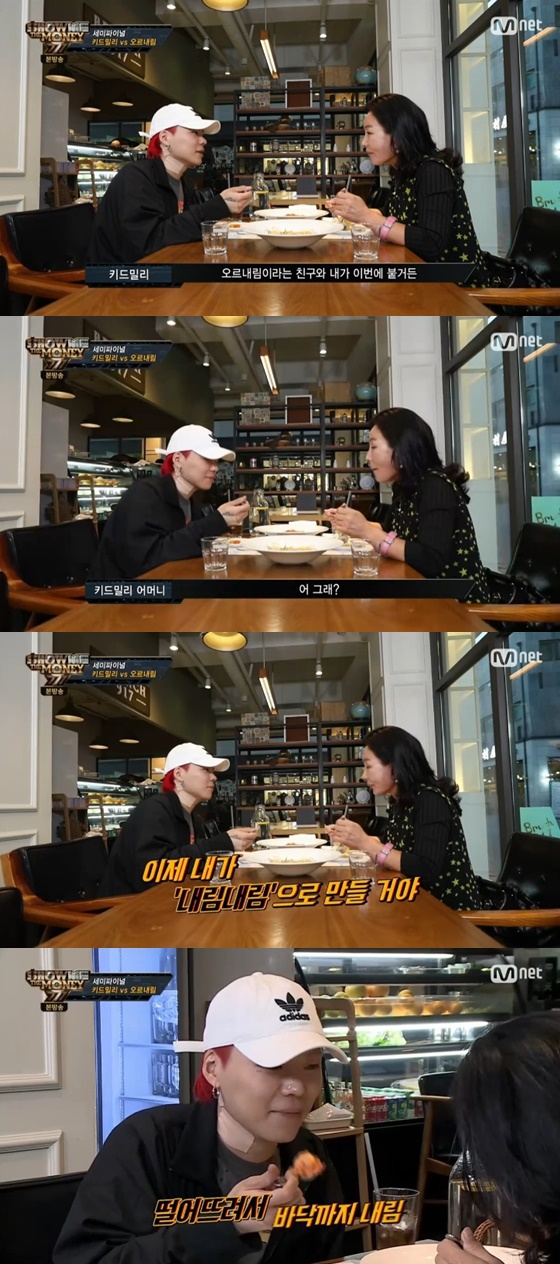 2일 오후 방송된 케이블채널 엠넷 예능 프로그램 '쇼미더머니777'에서는 키드밀리가 엄마와 만나는 모습이 전파를 탔다.