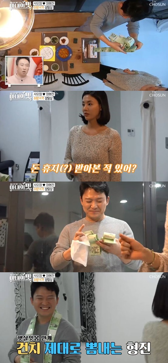 씻고 나온 정현진은 테이블을 정리하던 중 각 티슈에서 화장지를 뽑다 기쁜 마음을 드러냈다. 서유정이 현금을 이어 붙여 놓은 '돈 화장지'를 발견했던 것. 서유정의 깜짝 선물에 활짝 웃어 보인 정형진은 '돈 화장지'를 목에 감아 거울을 보는 등 만끽했다.