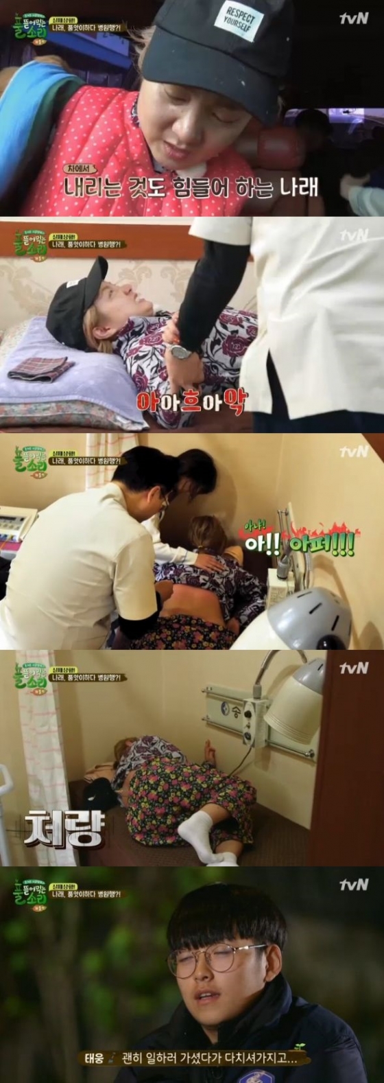 '풀 뜯어먹는 소리'에서 박나래가 연근을 캐다 피멍이 들고 허리를 다쳐 한의원을 찾아갔다.