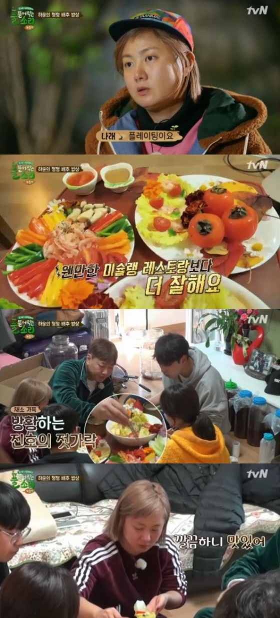 19일 오후 방송된 tvN 예능프로그램 '풀 뜯어먹는 소리'에서 송하윤이 요리하는 장면이 그려졌다.
