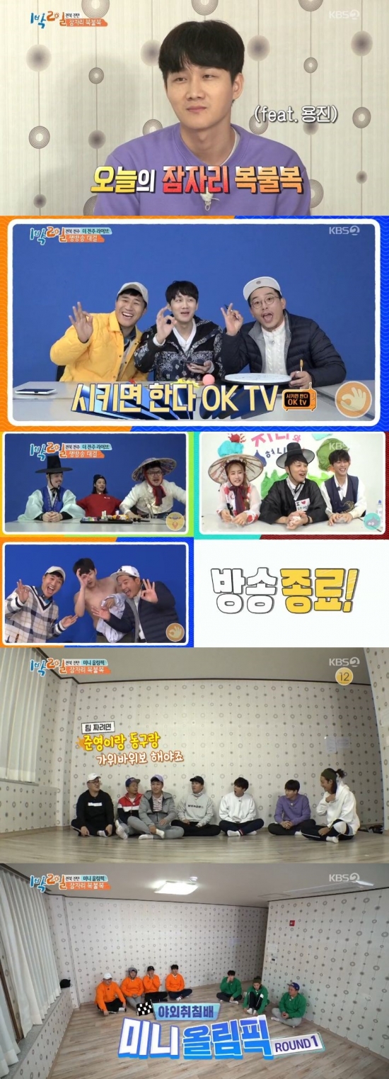 이후 '1박 2일'멤버들과 남은 이용진은 야외 취침을 놓고 잠자리 복불복 게임 '미니 올림픽'을 진행했다. 윤시윤을 필두로 차태현, 데프콘, 차태현이 한 팀, 정준영과 김준호 그리고 게스트 이용진이 한 팀이 됐다.