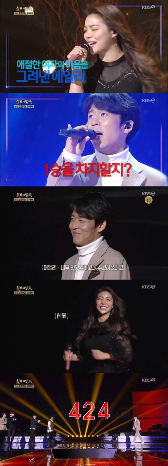 에일리는 故 김현식의 '내 사랑 내 곁에'로 파워 보컬을 자랑했다. 에일리는 412점을 득표해 몽니를 꺾고 1승을 거뒀다. 이후 김나니와 정석순 부부의 '그대와 영원히' 무대에서도 승리를 거둬 에일리는 2연승을 달렸다.