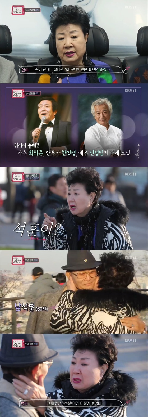 또 현미는 "나이가 드니까 옛날 사람이 그립다. 내가 올해 슬픈 연말을 맞이했다. 1월에 우리 친오빠가 돌아가셨다. 연이어 가수 최희준, 안무가 한익평, 배우 신성일씨가 돌아가셨다. 가까운 사람인데 돌아가시니까 너무 슬펐다"고 전했다. 이후 현미는 남산공원에서 남석훈과 만났다.