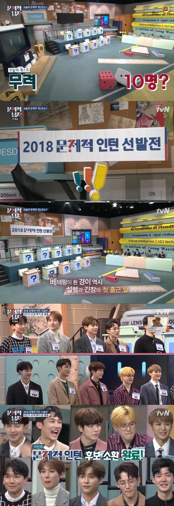 스튜디오에 출연진이 먼저 도착했다. 스튜디오에는 게스트 자리 10석이 있었고, 출연진은 놀라워했다. 전현무가 제작진에게 힌트를 알려달라고 했다. 천막이 걷히더니 '2018 문제적 인턴 선발전'이라는 플래카드가 걸려 있었다.