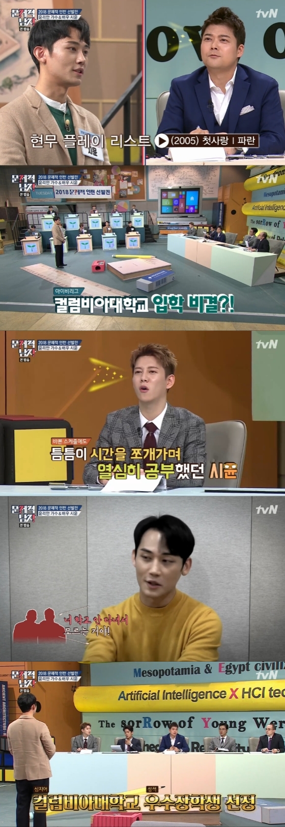 면접관을 맡은 문제적 남자 멤버들은 시윤의 경력에 놀라워했다. 사실 시윤은 15살 당시(2005년) 그룹 파란으로 데뷔했기 때문이다. 멤버들이 컬럼비아대학교에 입학한 비결을 묻자, 시윤은 "바쁜 스케줄에도 틈틈이 시간을 쪼개가면서 열심히 공부했다"고 밝혔다.