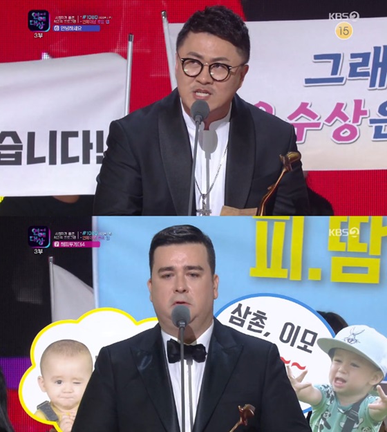가수 데프콘, 방송인 샘 해밍턴이 2018 KBS 연예대상에서 버라이어티 부문 최우수상을 받았다.