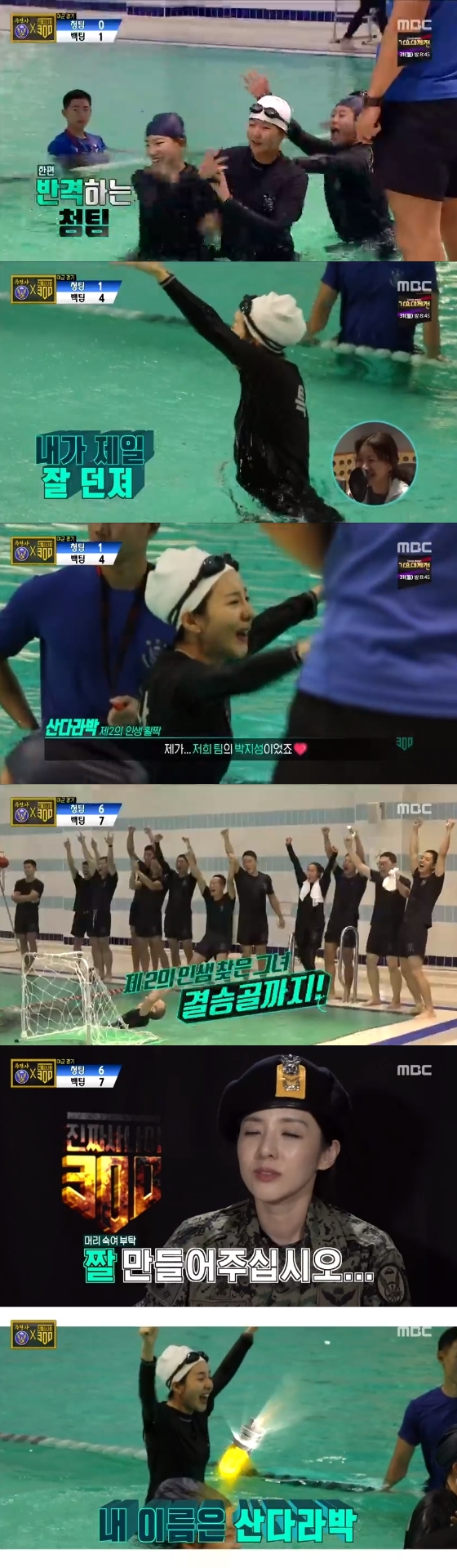 6:5 상황에서 백팀 신슬기 하사가 한 골을 넣었다. 6:6 동점 상황에서 산다라박이 결승골을 넣어서 점수는 7:6, 백팀의 승리로 경기가 끝났다. 산다라박은 제작진과의 인터뷰에서 "눈을 감고 슛했는데도 들어가서 이겼다. 이 훈련을 편집 안 하고 짧게라도 짤로 만들어달라"고 밝혔다.