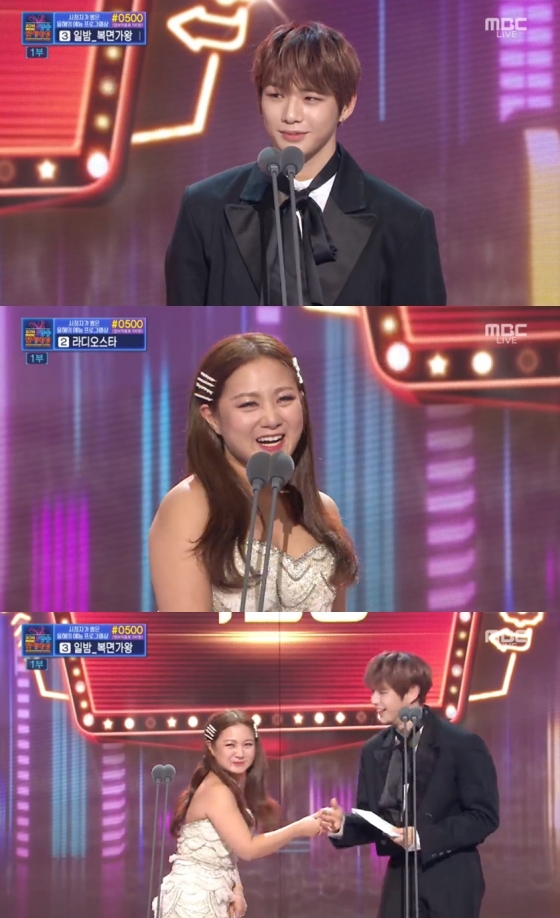 이날 자리에는 강다니엘과 박나래가 특별상 시상자로 등장했다. 박나래는 "이 자리에 강다니엘과 함께하게 돼 너무 감사하다. 매주 전현무와 무지개 회원들만 보다가 강다니엘 씨를 보니 이제야 방송국 같다"며 웃었다.