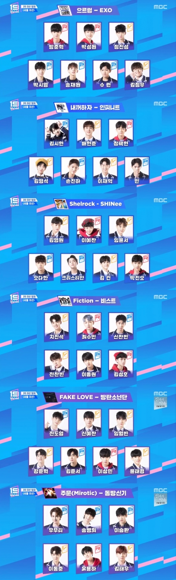 이날 예비돌들은 포지션 상관 없이 엑소의 '으르렁'부터 샤이니의 '셜록', 인피니트의 '내꺼하자', 비스트의 '픽션', 동방신기의 '주문'까지 총 6개의 팀으로 나뉘어 대결을 펼쳤다.