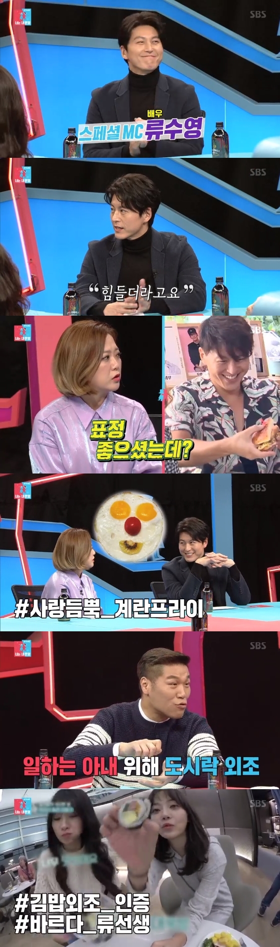 김숙이 "박하선이 이 프로그램에 출연하는 류수영 씨를 위해 특별히 응원했다"고 하자 류수영은 "계란 프라이에 얼굴을 만들어줬다. 힘내서 녹화하러 왔다"고 밝혔다.