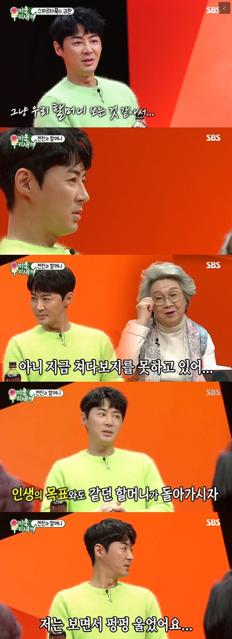 전진은 "2년 전 할머니가 돌아가셨다. 모든게 무너지는 기분이었고 인생의 목표를 잃은 것 같았다"라며 "박수홍 형의 어머니가 할머니와 많이 닮았다. 다른 분들은 '미우새'를 보고 즐거워하시지만 저는 보면 눈물이 난다"라고 눈물을 글썽였다.