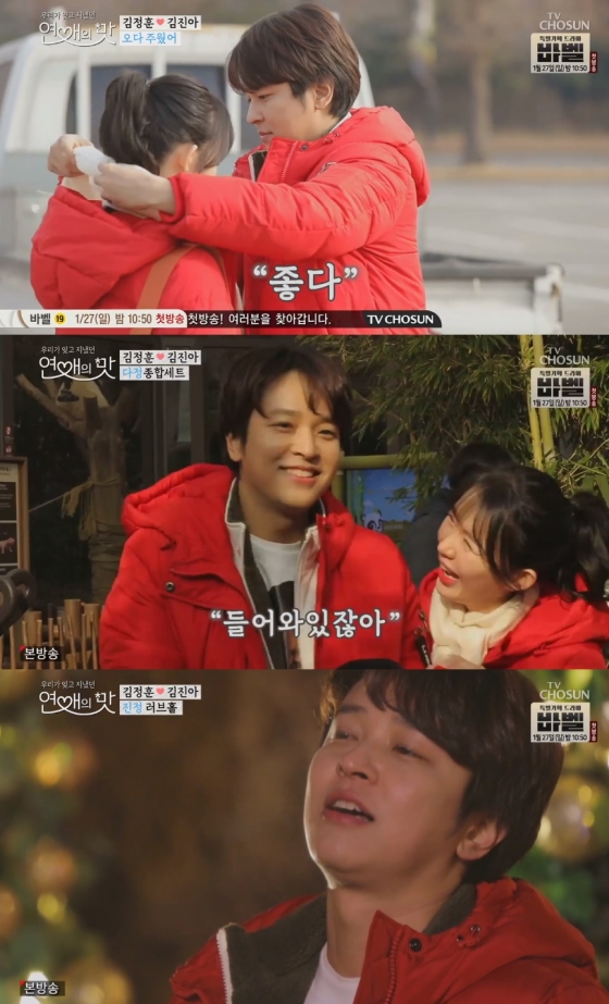 지난 24일 방송된 TV조선 예능프로그램 '연애의 맛'에서는 김정훈과 김진아가 만난지 50일을 맞아 놀이공원 데이트를 했다.