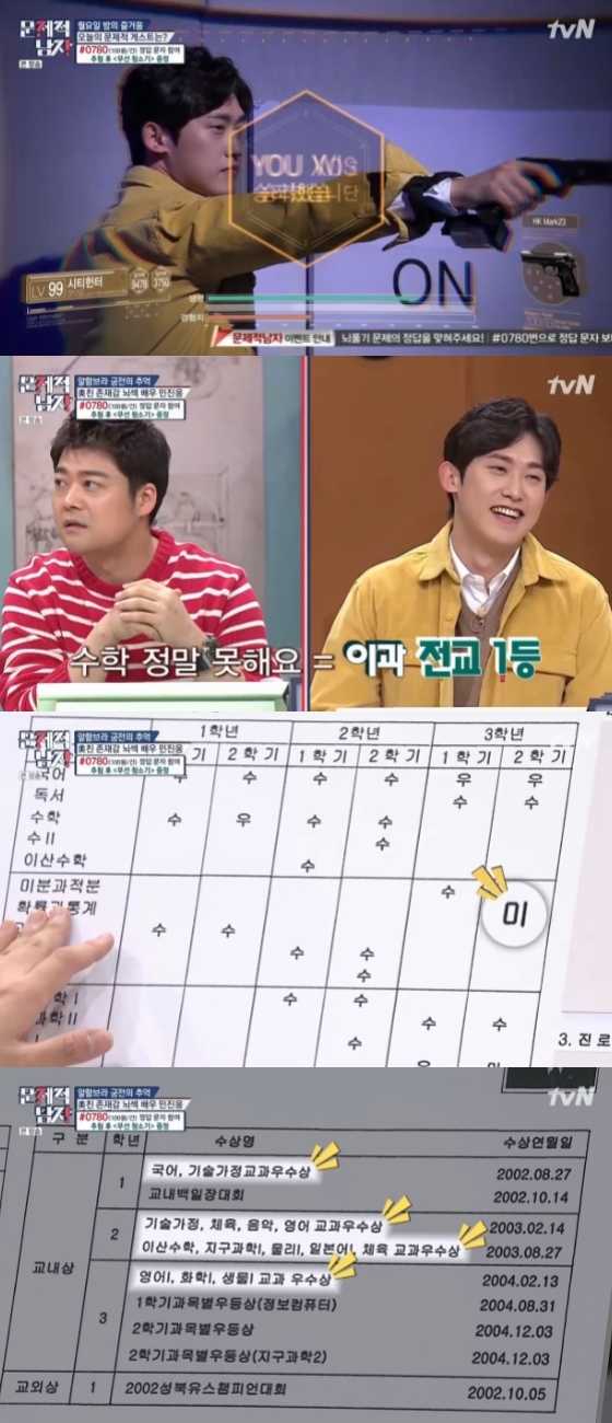 이어 민진웅의 학생생활기록부가 공개됐다. 3학년 2학기 때 '미'를 기록한 걸 제외하고 과목에 '수', '우'가 가득했다. 민진웅은 "3학년 1학기 때 수시 전형으로 대학교에 합격해서 이후에는 공부를 소홀히 했다"고 밝혔다. 이어 많은 교과우수상을 받은 걸을 보고 출연진은 놀랐다.
