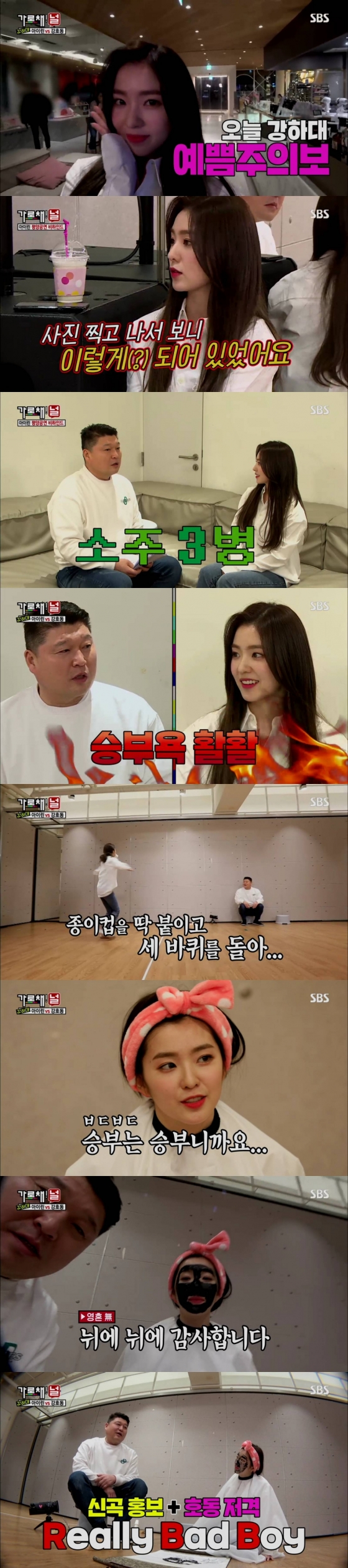이후 '강하대' 대결 종목으로 '컵반 던지기'가 펼쳐졌고, 아이린이 강호동에 패해 아이린이 얼굴 탁본벌칙을 받게됐다. 이 가운데도 아이린은 굴욕 없는 미모를 과시해 눈길을 끌었다.