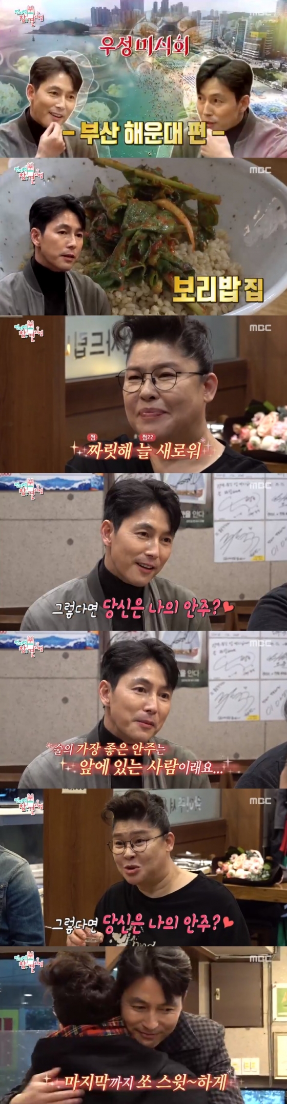 정우성은 "해운대에 밀면집이 있다. 거기에 아주 조그만 보리밥 집이 있는데 열무김치가 맛있다"고 입맛을 다시며 자신이 아는 맛집을 추천했다. 정우성의 제안으로 두 사람은 소주를 함께 했다. 이영자가 "술을 잘 못 하는데 누구랑 먹느냐가 중요하다"고 하자 정우성은 "술의 가장 좋은 안주는 앞에 있는 사람이다"라고 말했고, 이영자는 "그렇다면 당신은 나의 안주?"라며 웃었다. 이에 정우성은 "이거 마시면 나랑 사귀는 거냥?"이라고 자신의 영화 '내 머릿속의 지우개' 명대사로 받아치는 센스를 발휘했다.