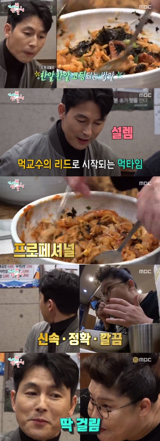 정우성은 "이정재도 '전참시' 애정자다"라며 절친과 함께 프로그램에 대한 애정을 밝혔고, 이영자는 먹교수답게 정우성에게 매운 낙지 비빔밥을 맛깔나게 비벼줬다. 식사 도중 이영자는 정우성에게 "(메뉴판에)원산지 좀 봐 달라"고 부탁했고, 정우성이 뒤를 돌아본 순간 이영자는 낙지 비빔밥을 폭풍 흡입해 폭소를 자아냈다. 이영자는 가게 주인들에게 맛 표현을 해줘야 좋아한다고 조언해줬고 정우성은 "낙지가 어쩜 이렇게 맛있지? 달아요♥"라고 능청을 떨었다.