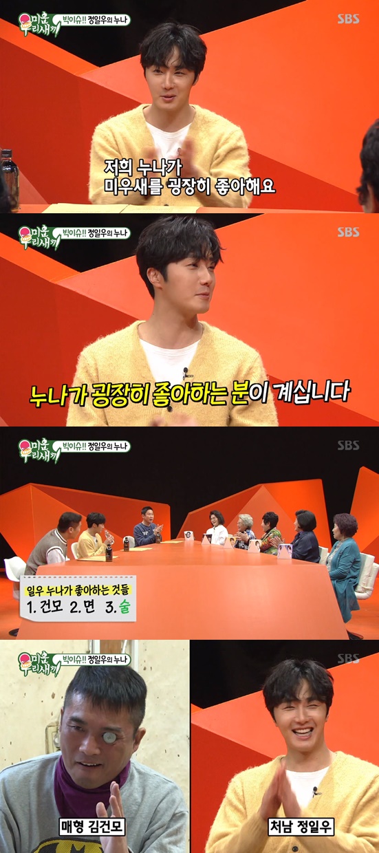 배우 정일우가 "저희 누나가 아직 싱글인데, 김건모 형을 굉장히 좋아한다"라고 말해 시선을 사로잡았다.