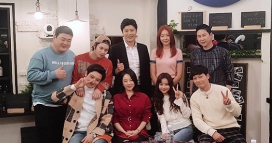 사진 속 한보름은 이날 함께 출연한 찬열, 박훈, 이시원, 그리고 '인생술집' MC들과 함께 포즈를 취하고 있다.