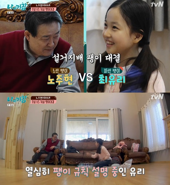 26일 오후 방송된 tvN 예능 프로그램 '나 이거 참'에서는 노주현이 설거지 하기 내기를 걸고 최유리 양과 요즘 초등학생 사이에서 유행하는 팽이 대결을 했다.