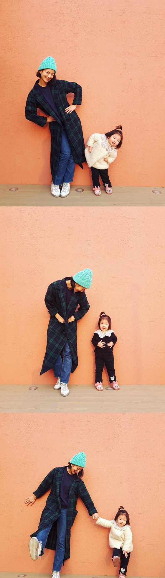 공개된 사진에는 같은 포즈를 취한 채 카메라를 응시하고 있는 아키바 리에와 딸의 모습이 담겼다.